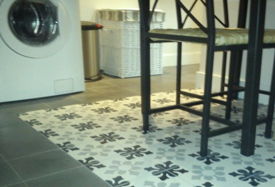 Como veis en esta foto el resultado de este suelo es perfecto también en una cocina de ambiente moderno....por eso fuera mitos de encasillar a la baldosa hidraúlica solamente con lo rústico.
